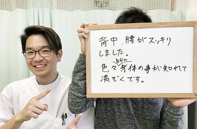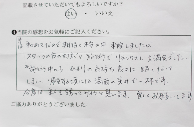 はりは初めてなので期待と不安の中来院しましたが、スタッフの方の対応と施術でリラックスし、大満足でした。