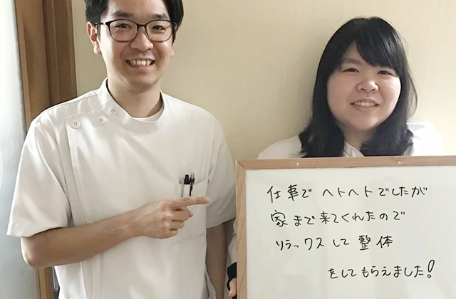 仕事でヘトヘトでしたが、家まで来てくれたので、リラックスして整体をしてもらえました!
