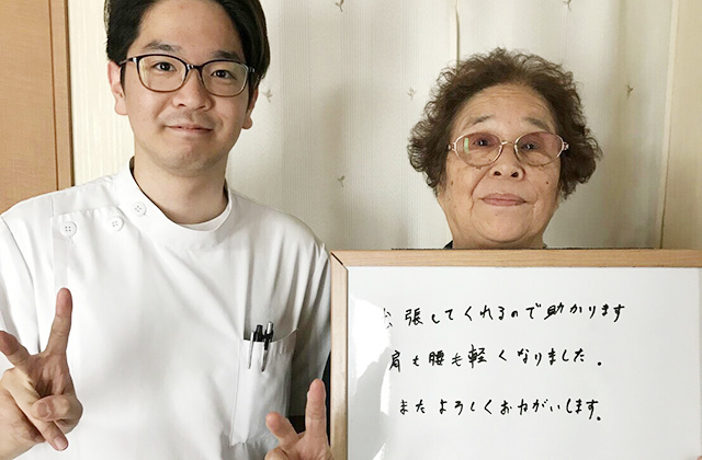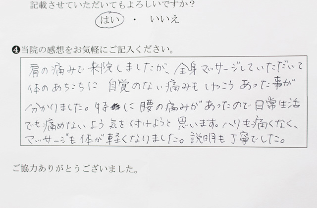 肩の痛みで来院しましたが、全身マッサージしていただいて体のあちこちに自覚のない痛みもけっこうあった事が分かりました。