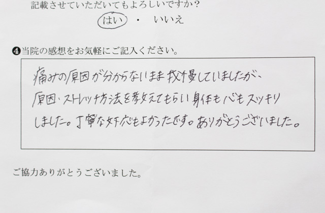 痛みの原因が分からないまま我慢していましたが、原因・ストレッチ方法を教えてもらい、身体も心もスッキリしました。