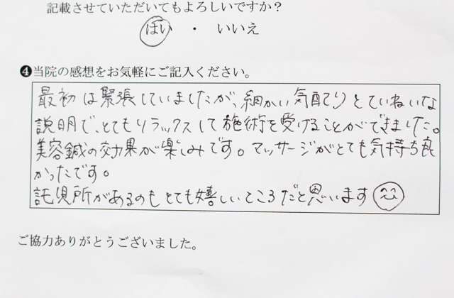 最初は緊張していましたが、細かい気配りとていねいな説明で、とてもリラックスして施術を受けることができました。