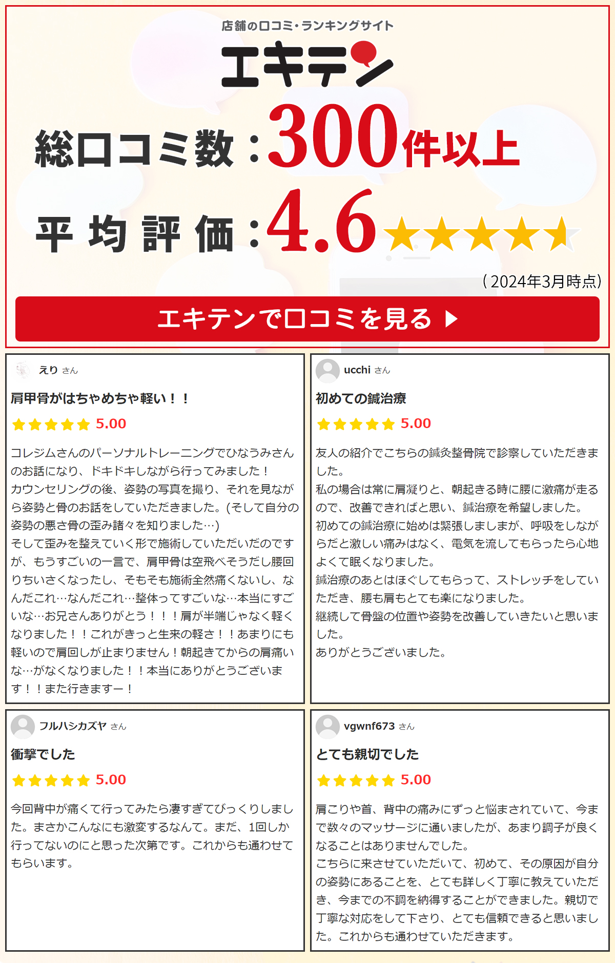 治療院選びに失敗しないためにも、しっかりと口コミも見て、比べて、納得した上でご来院いただくことをオススメします!