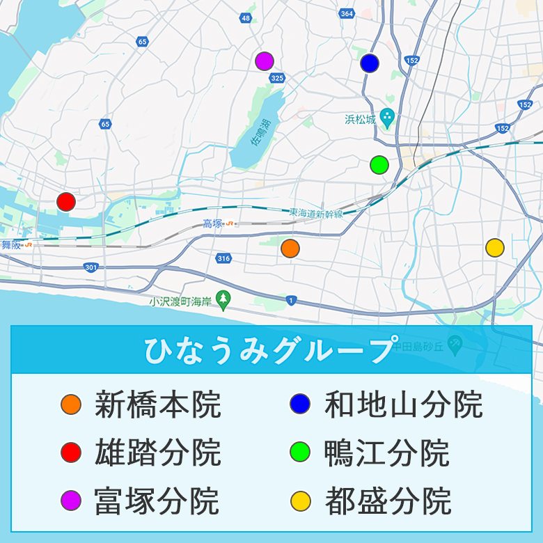 ひなうみは浜松市内に6店舗展開し、どの店舗でも最善の施術をご提供できる体制を整えておりますので、近くて通いやすい店舗を選択していただくことが可能です。